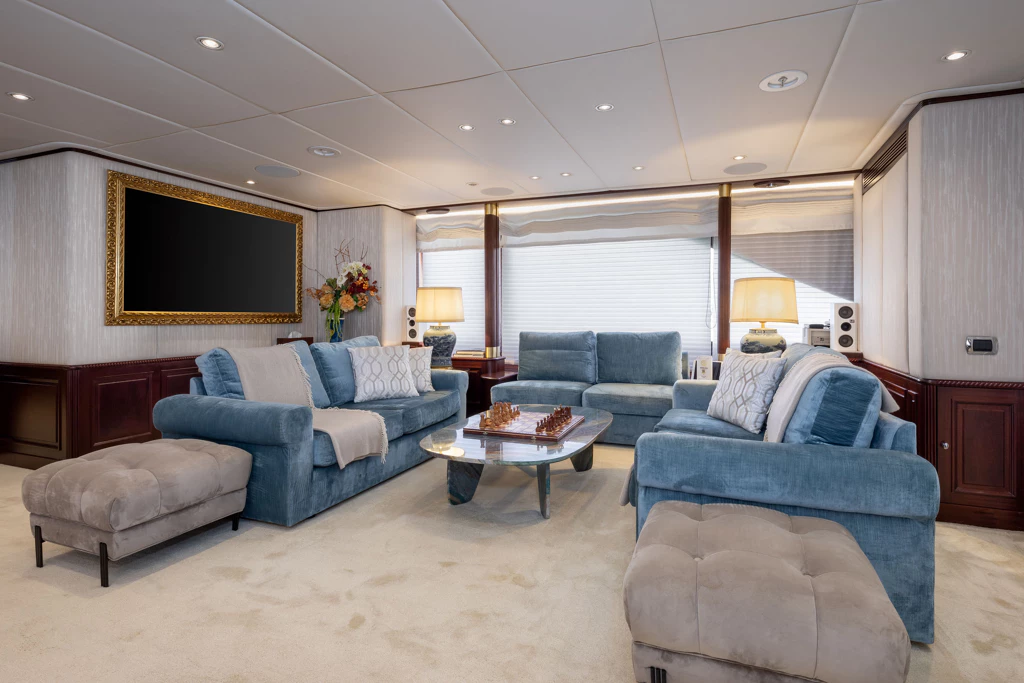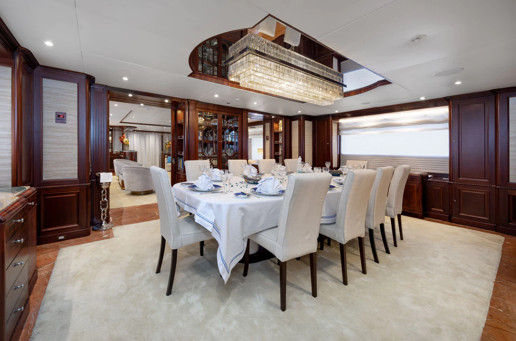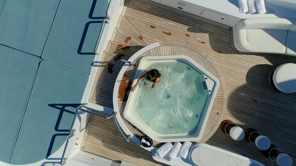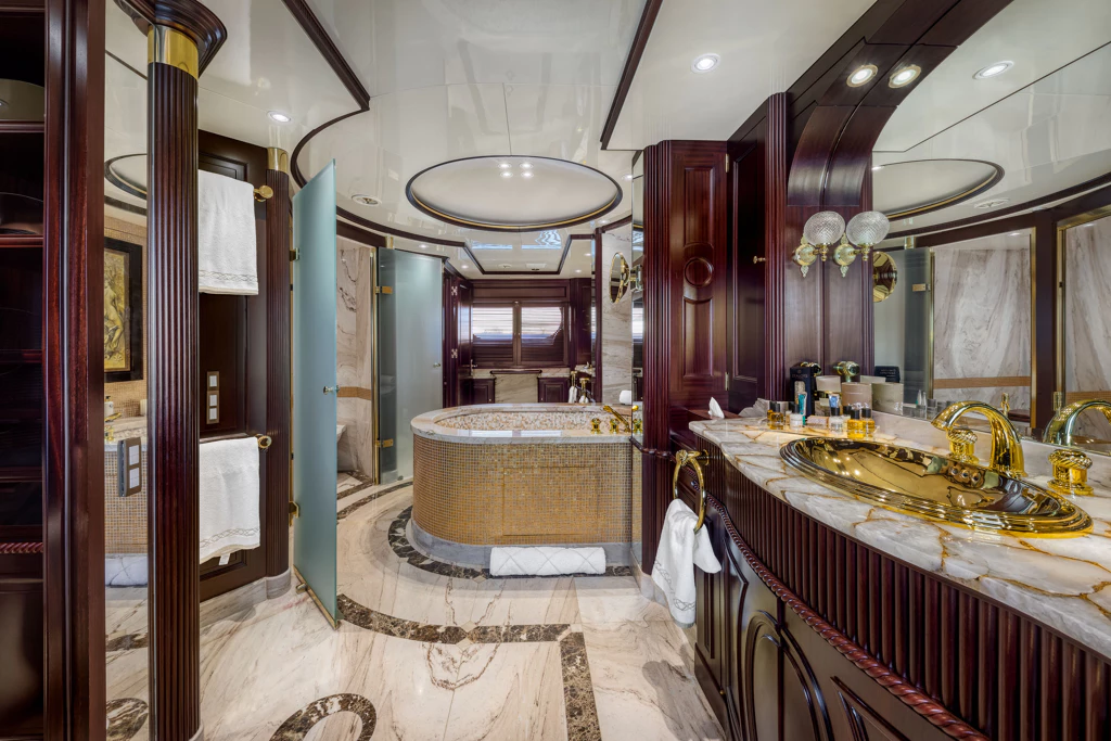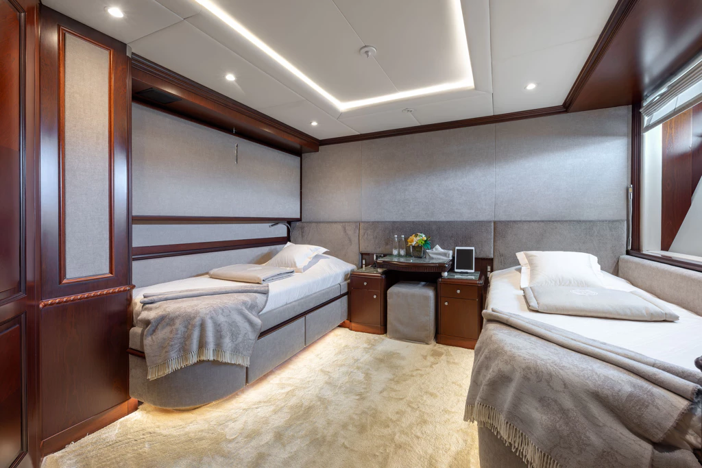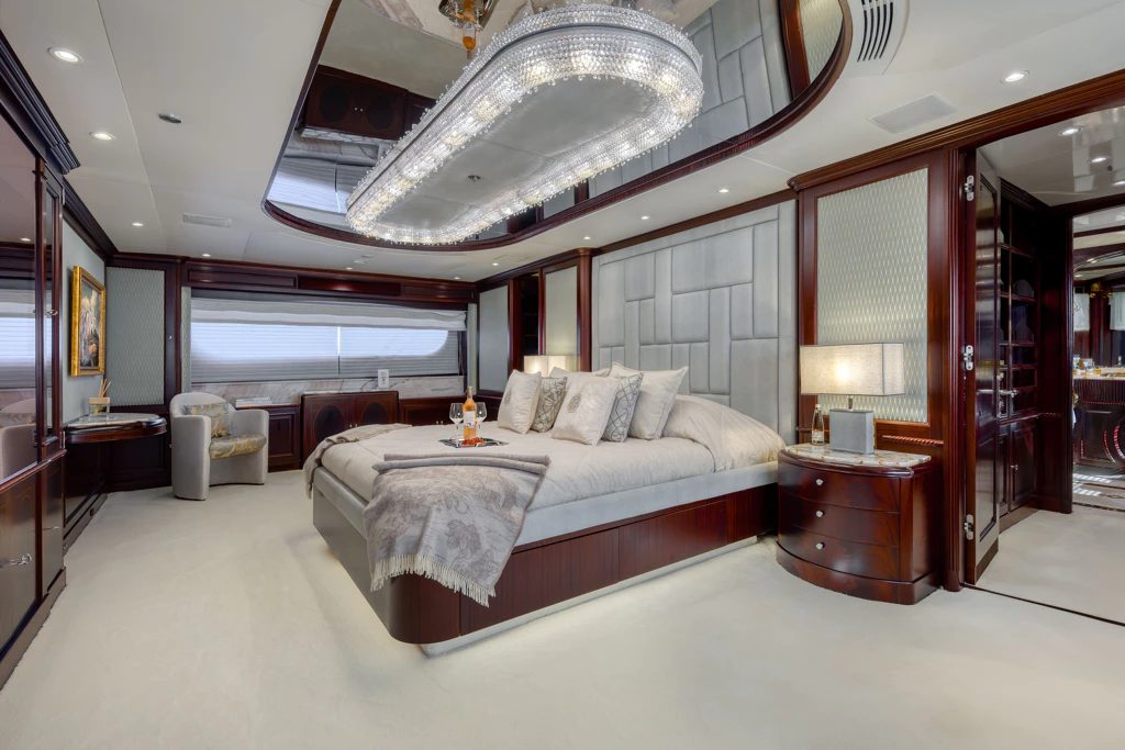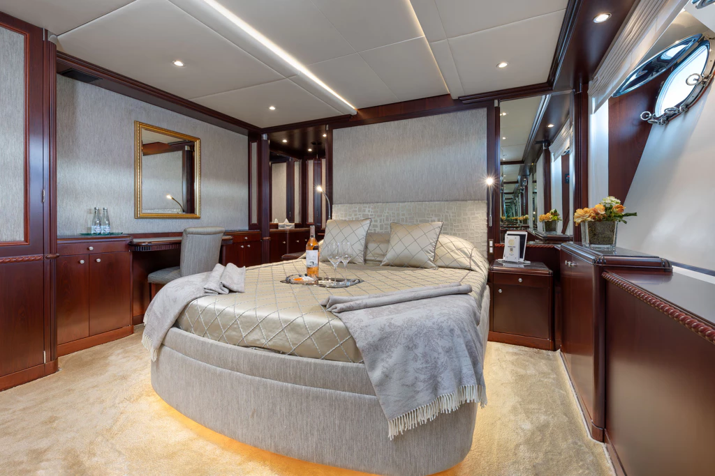 This magnificent vessel can accommodate 12 guests across six lavish staterooms, each with ensuite facilities. The full-beam Master Suite on the main deck features a king-size bed and a generous ensuite bathroom complete with a large hot tub. Meanwhile, her lower deck’s VIP staterooms and additional suites offer tailored comfort for both families and groups of friends.