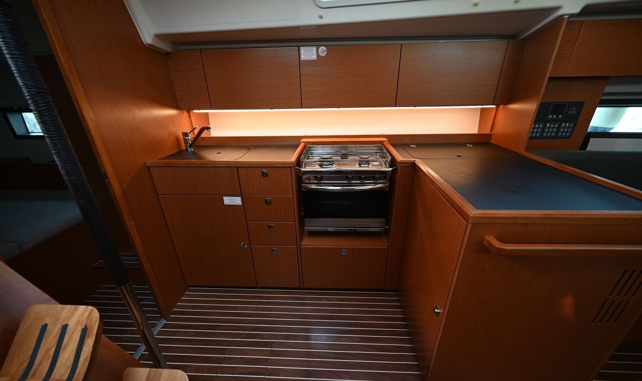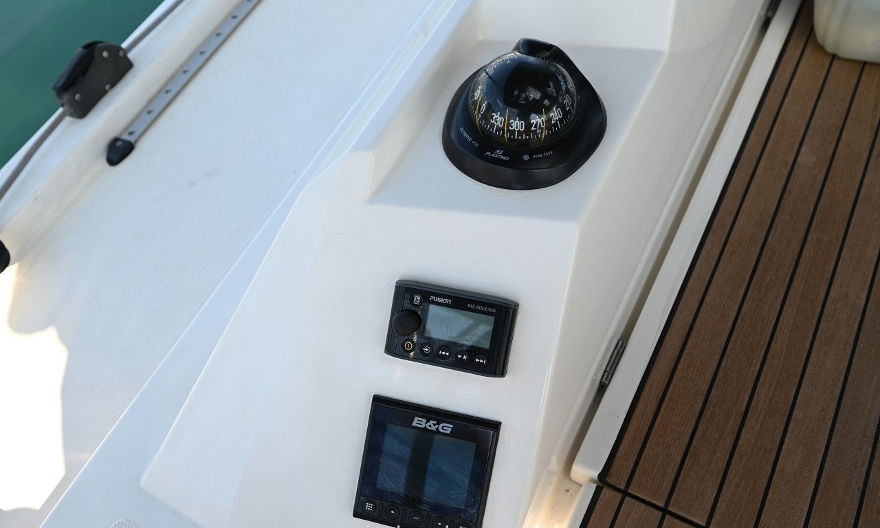 Furling mainsail, Furling Genoa, Engine Yanmar 57hp, Full set of B&G instruments, GPS, Autopilot, VHF, Electric fans in saloon and cabins, LED Lights, Refrigerator, Gas stove, Oven, Hot water, Electric bilge pump with level-control indicator, Gangway, cockpit table and cockpit cushions, swimming platform, fenders, ropes, swimming ladder, boat hook, winch handles, EPIRB, Liferaft for 8 pax, full safety equipment, oars for tender, Gas bottles, tools and spare parts