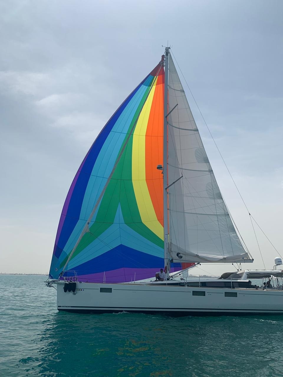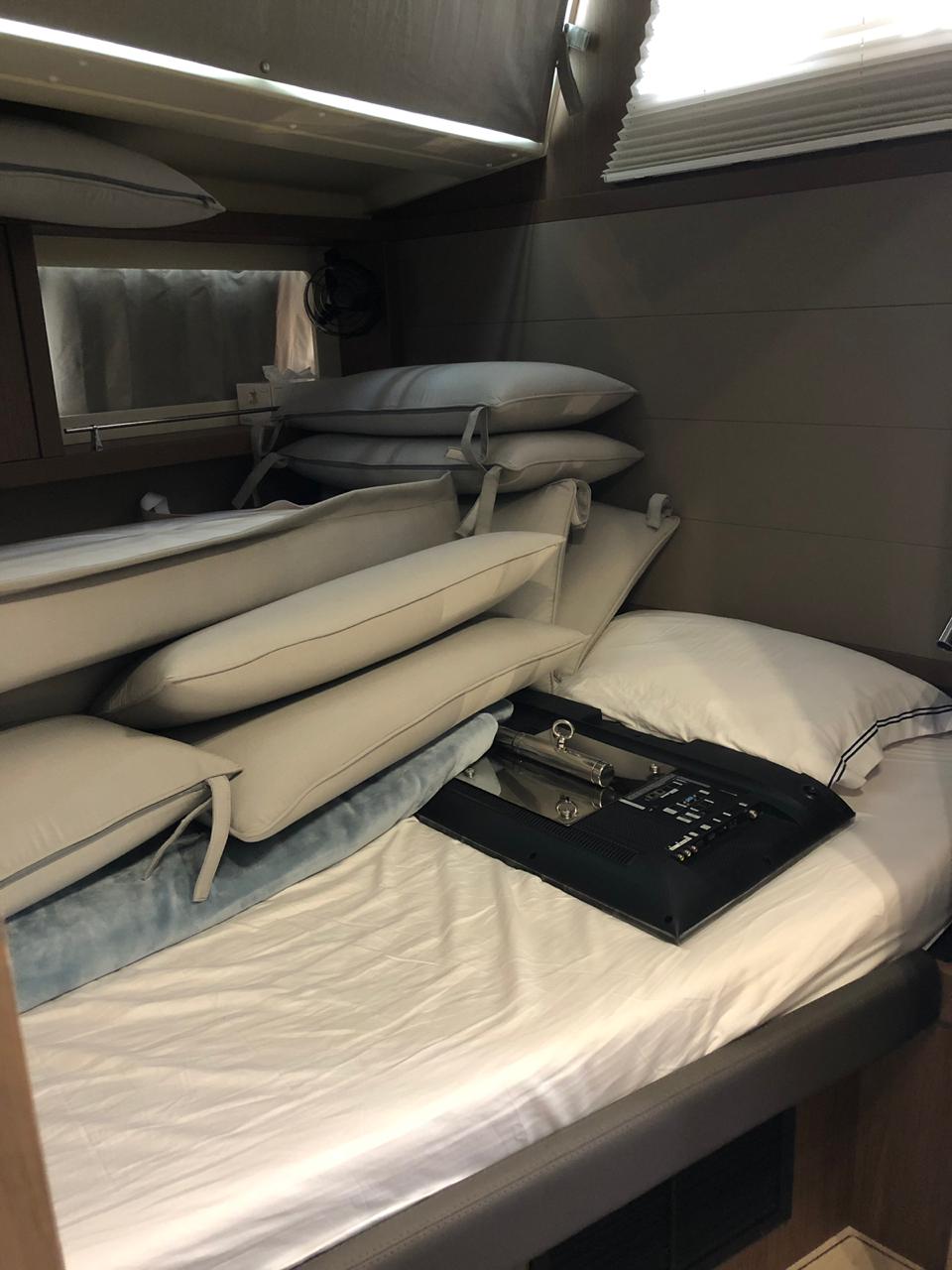 Battened main sail (2018), Roller Genoa (2018), Spinnaker Maxi Asymmetric, Rigging 2018, Engine Yanmar 110 hp, Full set of B&G Instruments, 2 x B&G GPS – Plotters, Generator Onan 13,5 kWa, A/C 1 Unit 72.000 BTU, 3 Double cabins with en-suite bathrooms + 1 Skipper cabin, Radar, AIS Tridata, Hydraulic Platform, 4 Electric winches Harken