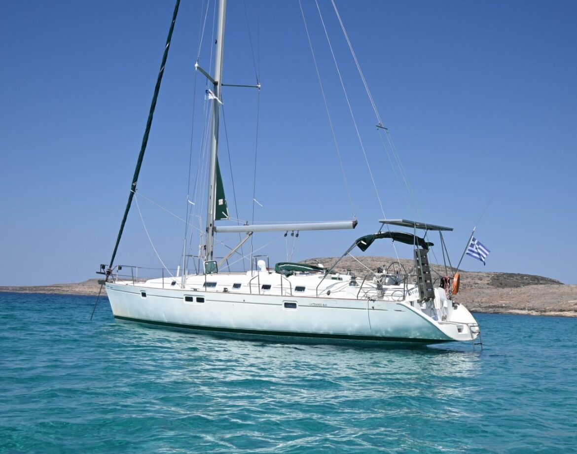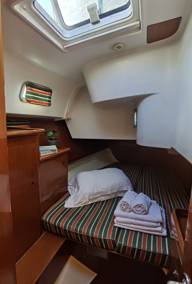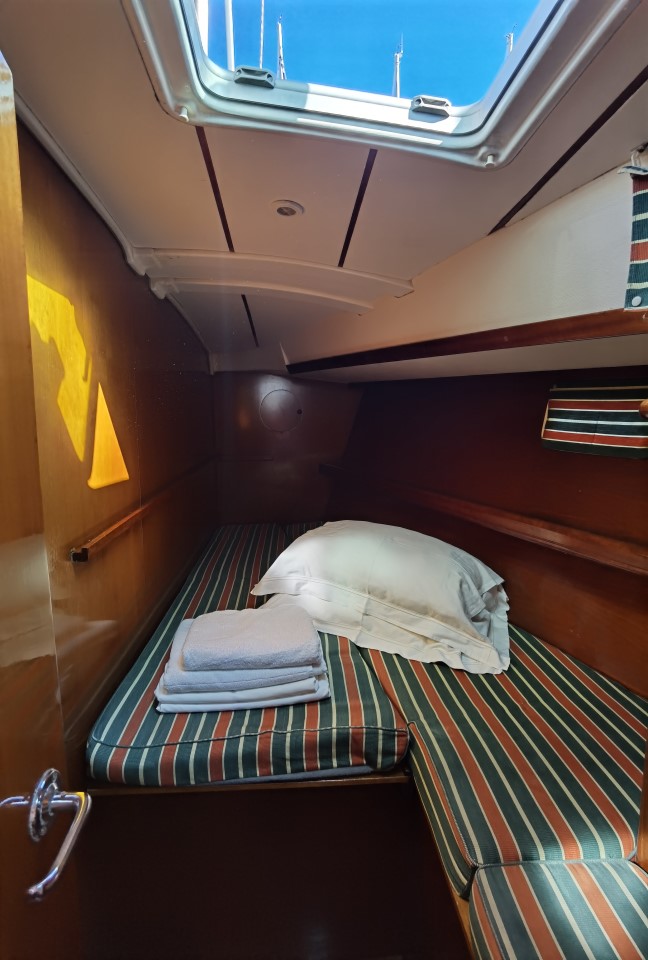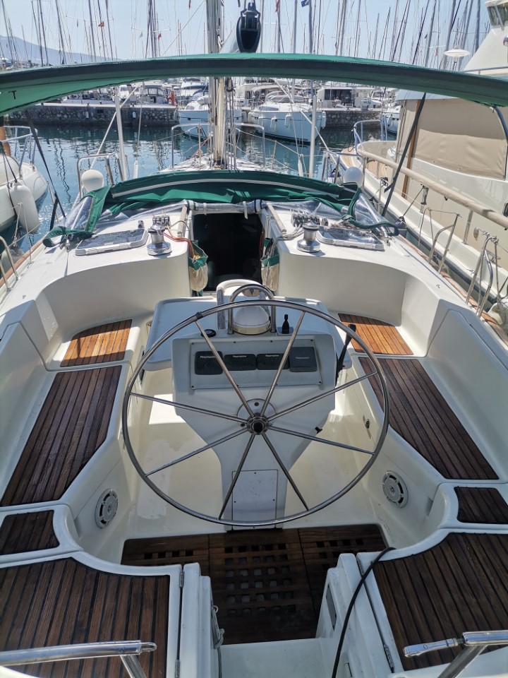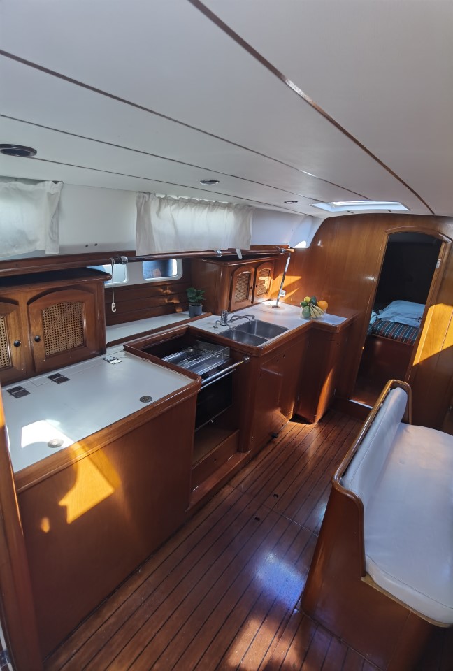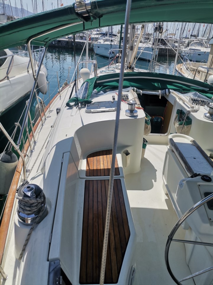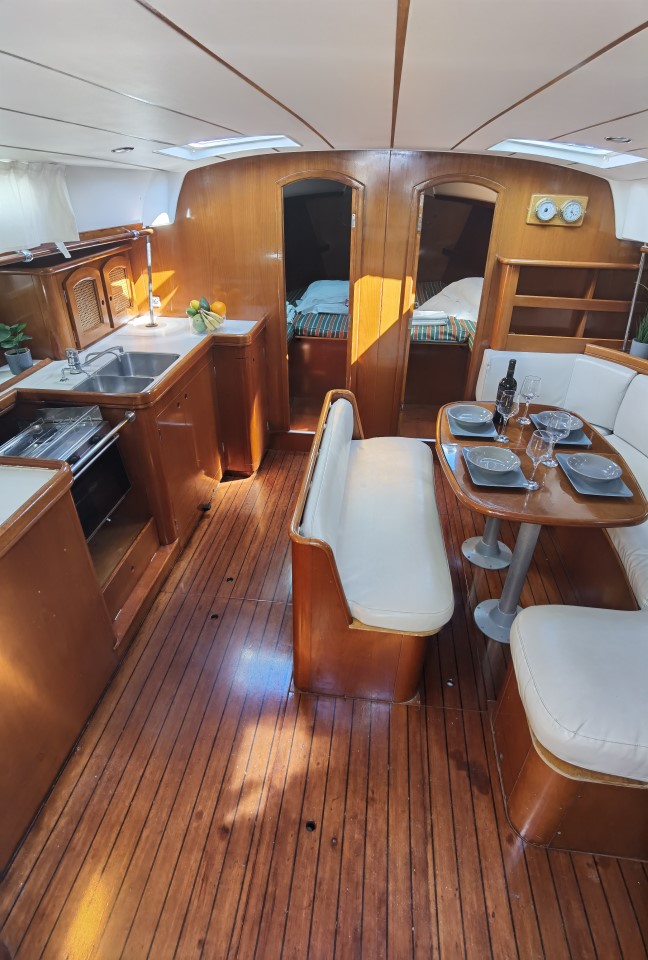 Furling mainsail (2025), Furling Genoa, Engine Yanmar 63 kWa, Full set of Raymarine instruments, GPS – Plotter Garmin in cockpit & inside, Electric windlass Lofrans 1500W, Spare anchor, Electric fridge & Freezer, Convertible table in saloon