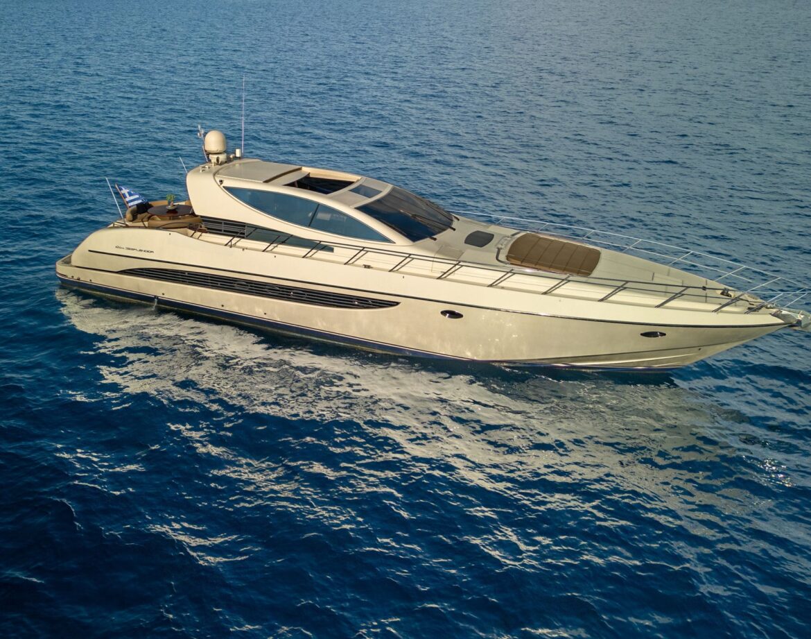 Riva 72, an elegant yacht that Riva describes as a “cabriolet sports cruiser”. She features a retractable sunroof on her main deck salon, flooding the interior with sunlight and at her lower deck there is a large semi-transparent skylight, also allowing natural light to enter. The most important part of the boat – the aft deck, is right next to the meticulously composed main saloon. The main saloon is a friendly space with comfortable seating & entertainment areas and enables a number of media entertainment options. She the ideal option for weekend getaways and romantic cruises.