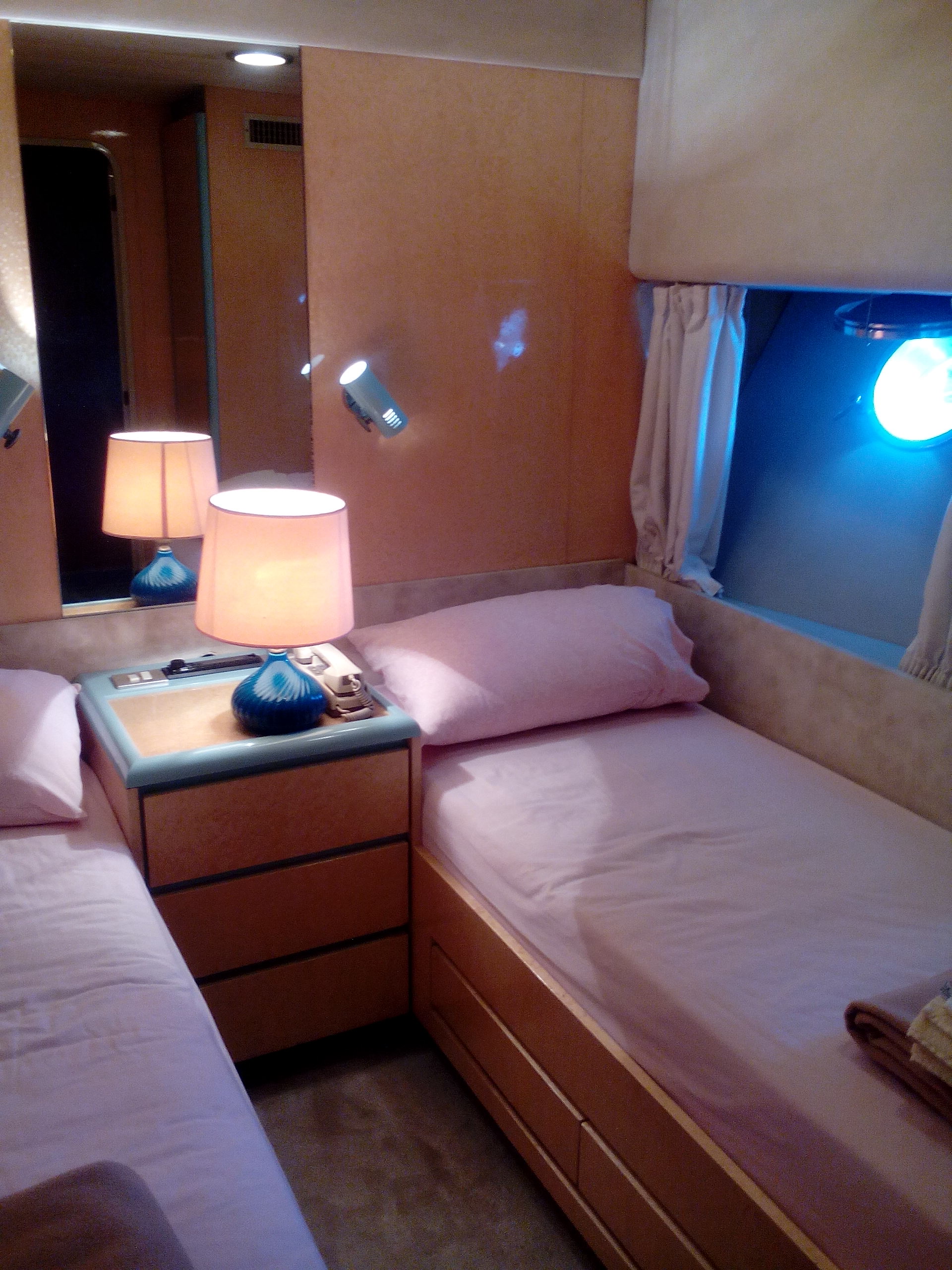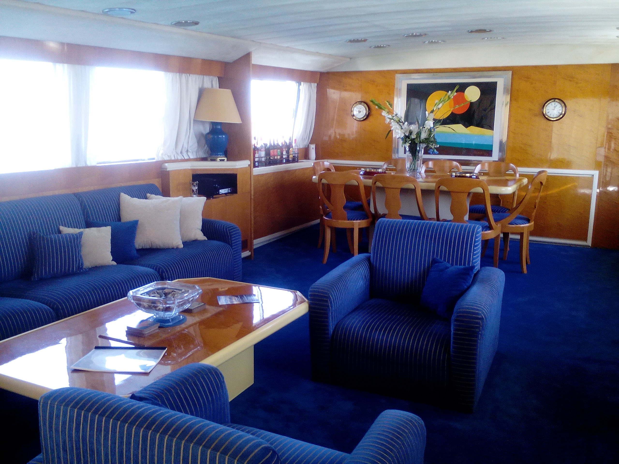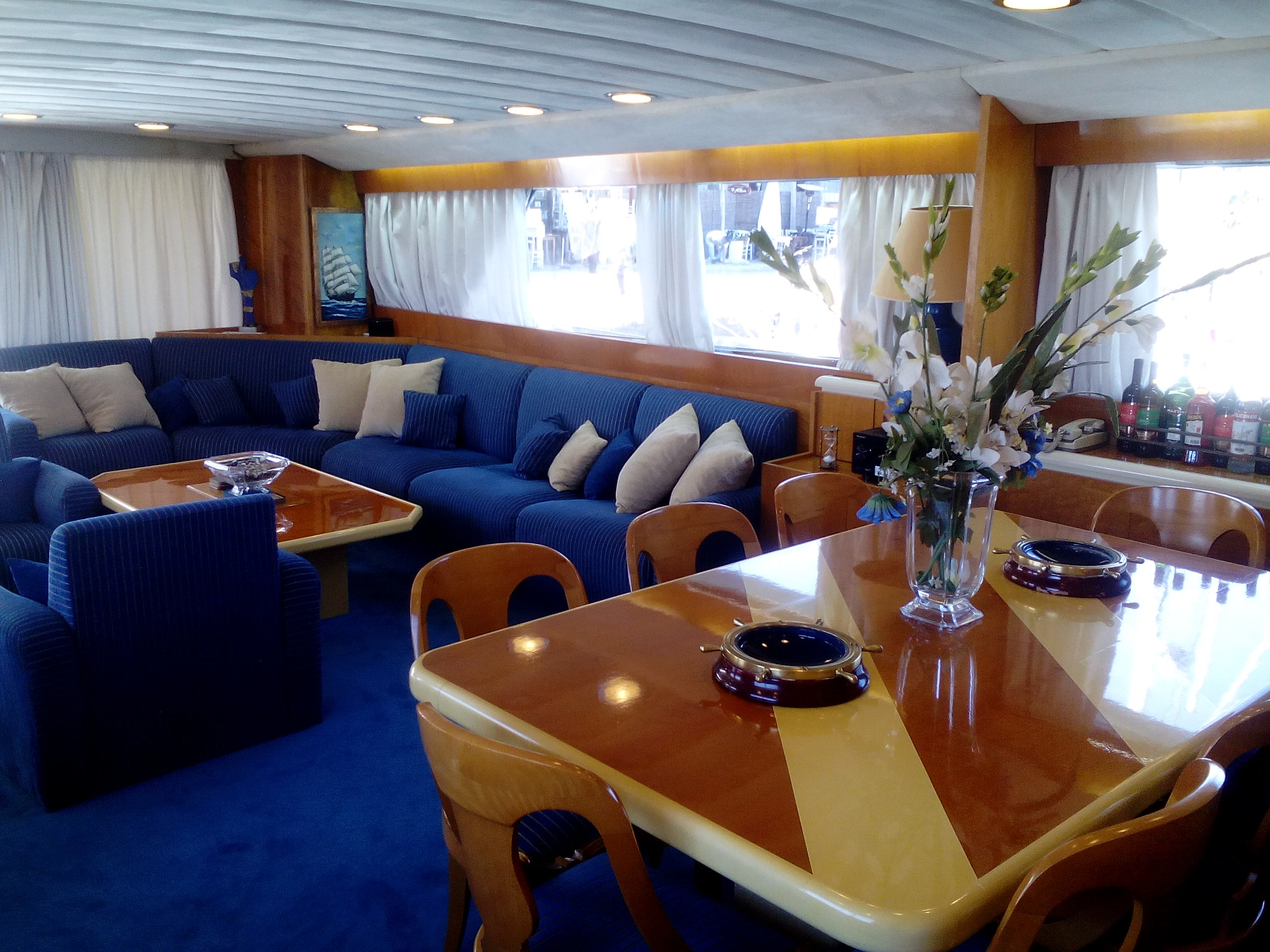 Engines 3 x General Motors 650 hp (1.950 hp total) with general maintenance of the engines (2017): cleaning of fuel injectors, turbo, water coolers, exhausts, and replacement of exhaust insulation, Cabins 5 + 2, Full Set of Instruments, VHF, Compass, Radar, 2 x Onan Generators 30kwa in total, Fully air-conditioned, Flybridge with dining space, Full equipped Galley with 3 Refrigerators, Dishwasher and kitchen, washing machine, hydraulic gangway, Crane for dinghy, teak deck, winches and flaps, complete fire extinguishing system with permanent co2 extinguishing system, Safety equipment includes 3 lifeboats for a total of 27 people and EPIRB, telecommunications equipment, October 2023 maintenance was carried out with the issuance of all required certificates